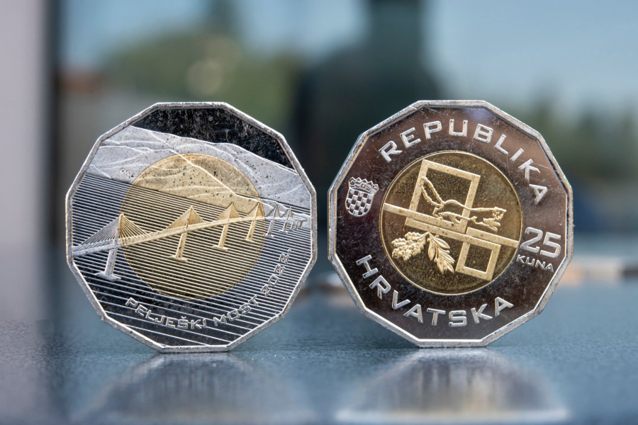 “U povodu otvaranja za promet Pelješkog mosta i cestovnog povezivanja teritorija Republike Hrvatske, važnoga političkoga, gospodarskog i društvenog događaja za Republiku Hrvatsku, Hrvatska narodna banka 26. srpnja ove godine pušta u optjecaj novi prigodni optjecajni kovani novac od 25 kuna. Autor idejnoga i likovnog rješenja akademski je kipar Damir Mataušić. Nova prigodna optjecajna kovanica otkovana je u Hrvatskoj kovnici novca i izdaje se u količini od 30.000 komada.