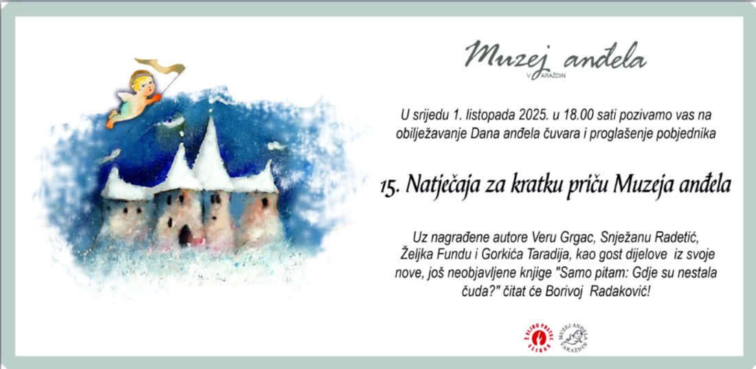s velikim zadovoljstvom pozivam vas da 1. listopada u 18 sati, u Muzeju anđela Varaždin, budete dio posebnog trenutka – proglašenja pobjednika i čitanja priča koje su obilježile ovogodišnji natječaj.