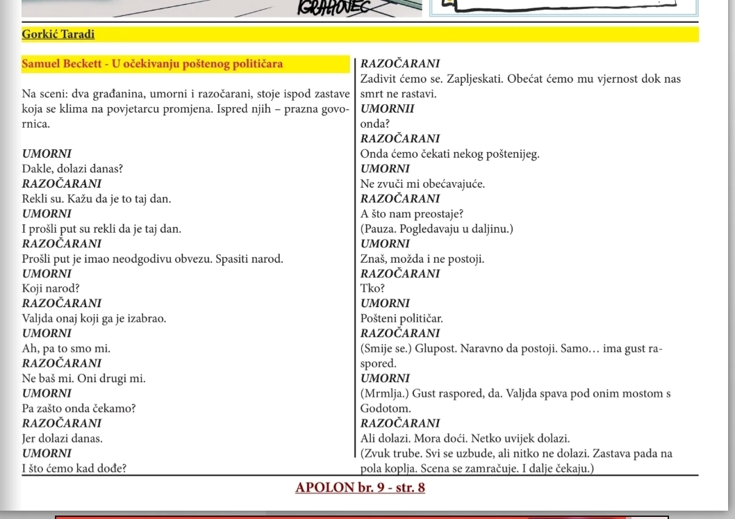 U 9. broju humorističko-satiričkog e-časopisa Apolon objavljena je moja humoreska “Samuel Beckett – U očekivanju poštenog političara” koja je sada, vjerujem, više nego aktualna. Što mislite?