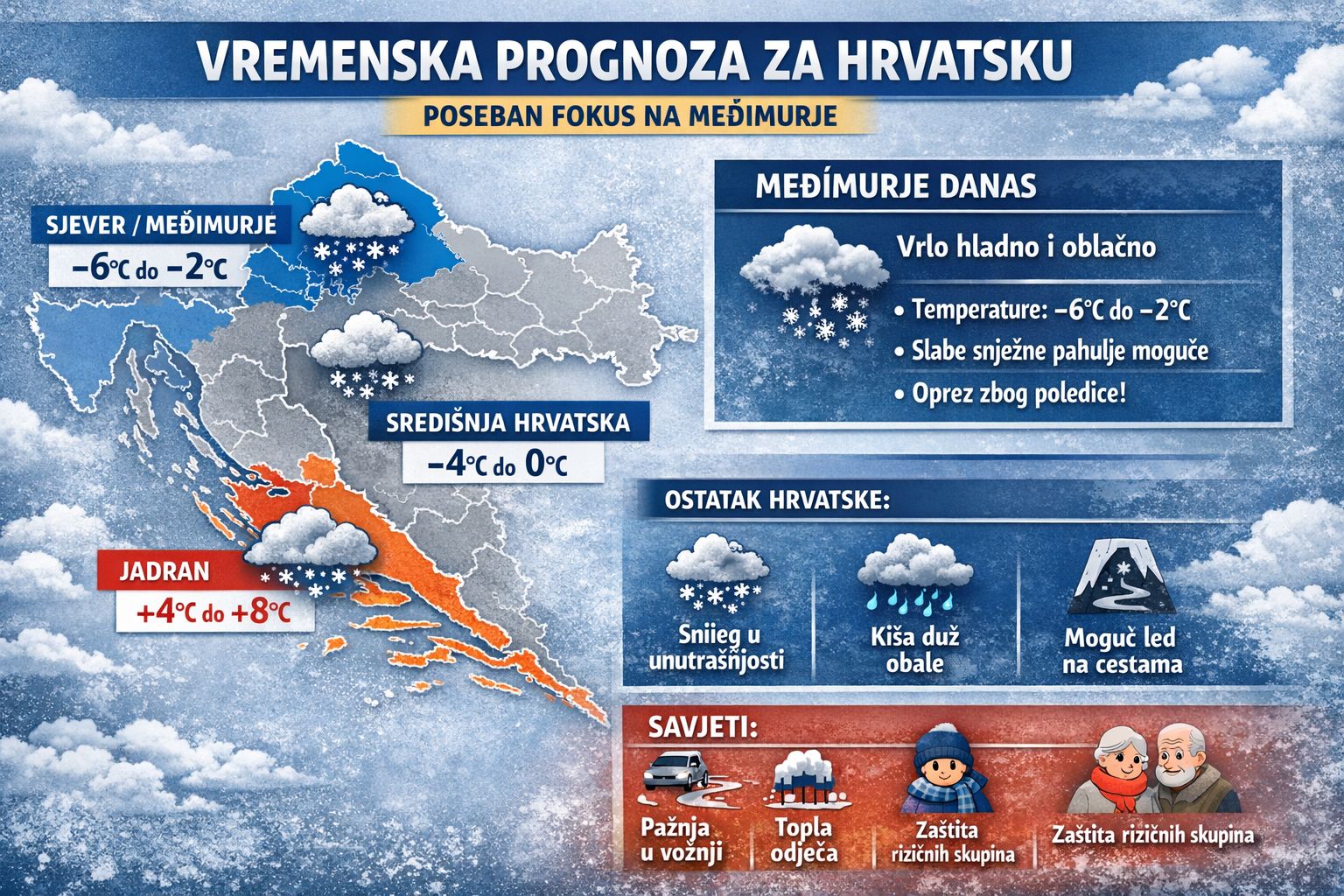 U Međimurskoj županiji jutro 7. siječnja donosi vrlo hladno i oblačno vrijeme s temperaturama koje se kreću nekoliko stupnjeva ispod nule. Tijekom jutra i prijepodneva nema najavljenih većih oborina, ali zbog izrazito niskih temperatura moguća je pojava suhog snijega ili sitnih pahulja koje se neće zadržavati u većim količinama. Slab do umjeren vjetar dodatno pojačava osjet hladnoće.